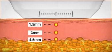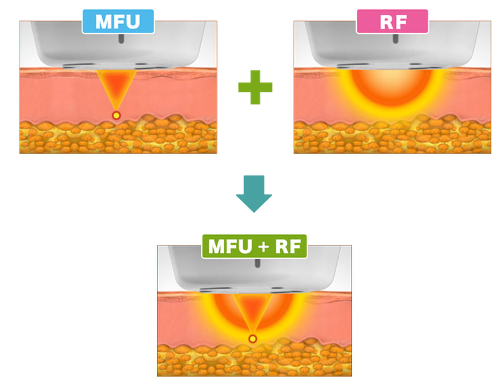 皮膚の深い層にある表在性筋膜(SMAS層)に働きかけるたるみ治療、いわゆる高密度焦点式超音波(HIFU)と、世界初のMFU(マイクロフォーカス超音波)に加えて、新たにRF(高周波)の組み合わせ照射が出来る複合機器です。