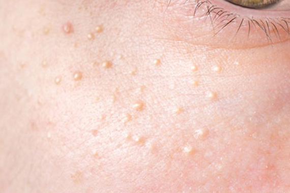主に眼のまわりに直径1~2mmの白くてかたい丘疹(ブツブツ)が多発します。